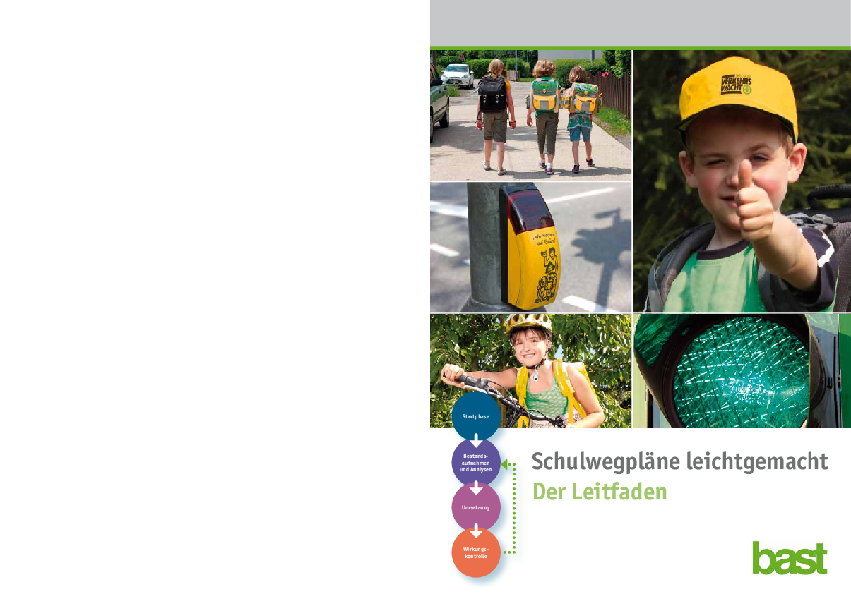 Im Rahmen des Forschungsprojektes „Entwicklung, Verbreitung und Anwendung von Schulwegplänen“ wurde ein Leitfaden zur Erstellung von Schulwegplänen erarbeitet. Der Leitfaden beschreibt den Erstellungsprozess in vier Arbeitsschritten ganz konkret und versetzt auch Laien in die Lage, typische Verkehrssicherheitsprobleme zu erkennen. Durch Bereitstellung aller notwendigen Vorlagen für die verschiedenen Arbeitsschritte (u.a. Mustereinladung zur ersten Sitzung, Tagesordnung, Musterfragebogen, Auswertevorlagen, Checklisten für die Begehung, Musterschulwegplan, Verkehrssicherheitssymbole) wird die Arbeit sehr erleichtert und auf die individuellen und örtlichen Aspekte fokussiert.